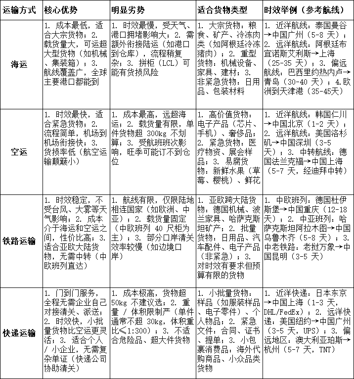 T/T(电汇):最常用,分 “预付”(先付 30% 定金,货到付尾款)和 “后付”(货到后付款),适合熟悉的供应商,操作简单,银行手续费低(几百元 / 笔);L/C(信用证):安全但复杂,银行担保付款,适合大额或新合作供应商,需提前跟银行沟通开证,费用约货值的 0.1%-0.5%;提醒:合规操作的话,进口货物的货款要由进口报关单上的境内收货人支付给国外发货人,其他付款方式都不合规,存在风险。6. 如何选择合适的进口运输方式?